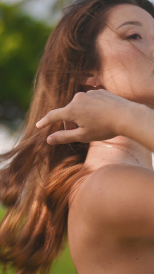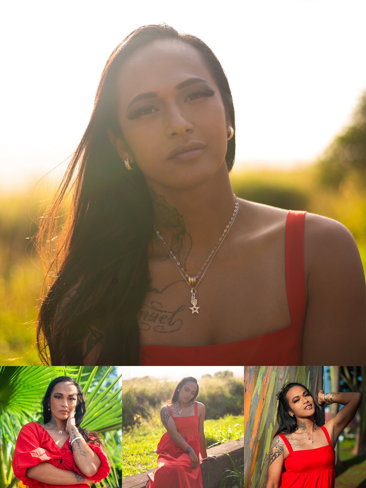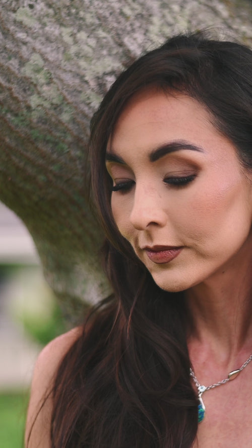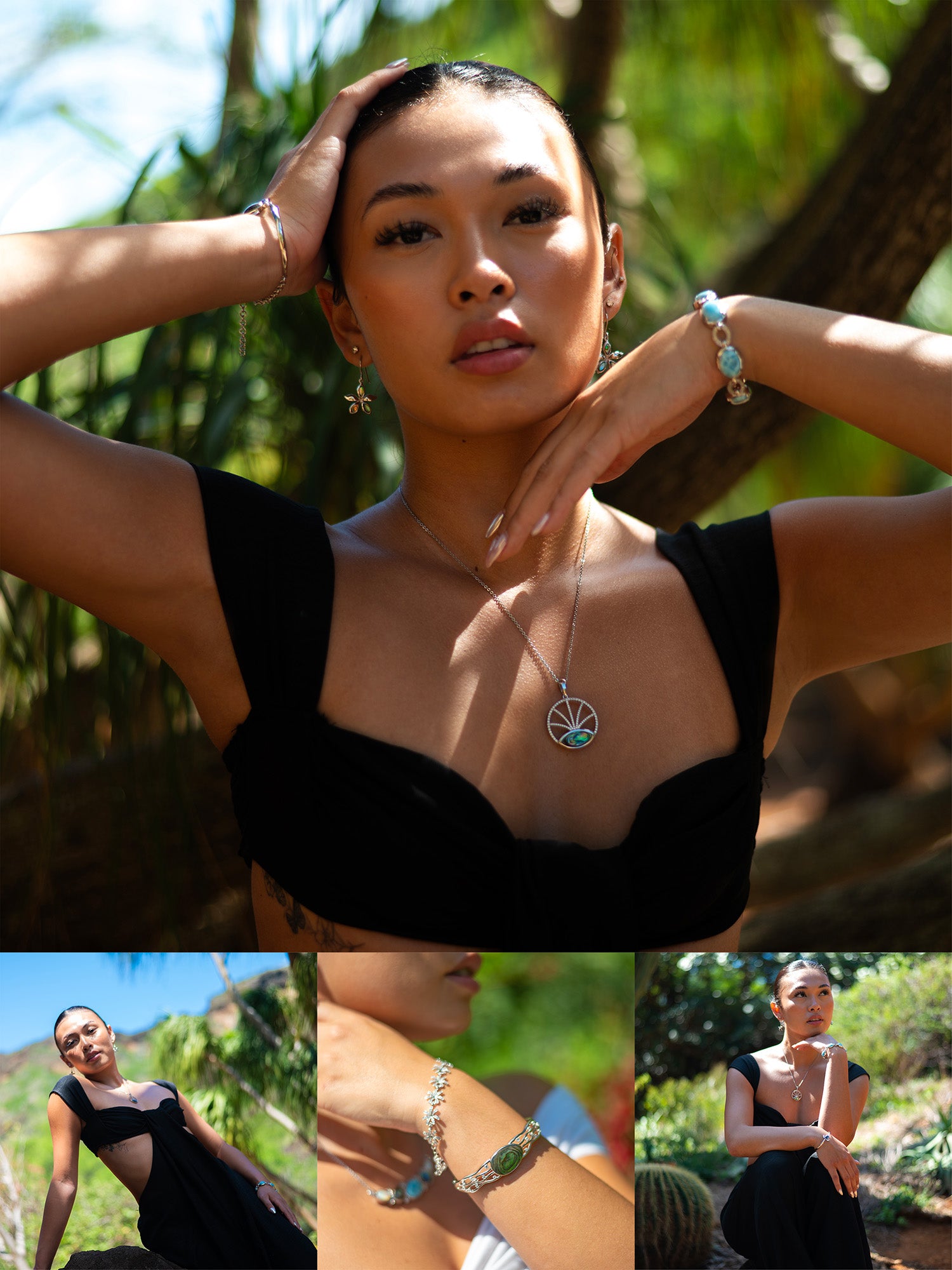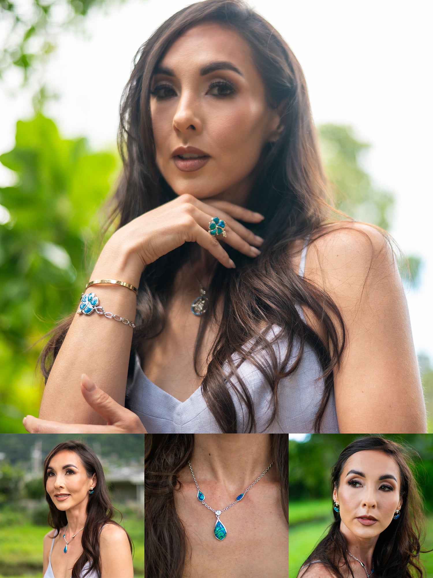Surrounded by the beauty of Koko Crater Botanical Garden, Faith glows in our Abalone and Larimar jewelry. As owner of Kuluna Kinis, her mix of business savvy and island grace is undeniable. The jewelry’s blend of sea and land elements echoes her balance of elegance and ambition.