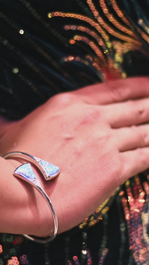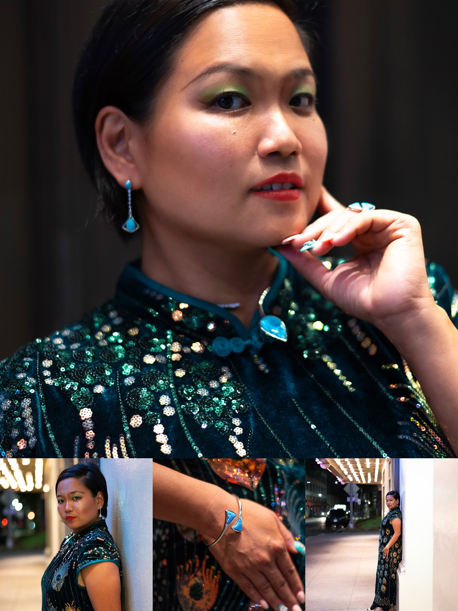 Angela stuns in our Larimar & Opal Classic Collection, a blend of art deco geometry and timeless island elegance. Known for her advocacy in anti-bullying and women’s empowerment, Angela pairs beauty with substance. Her look is as polished and thoughtful as her voice in the community—elegant, bold, and inspiring.