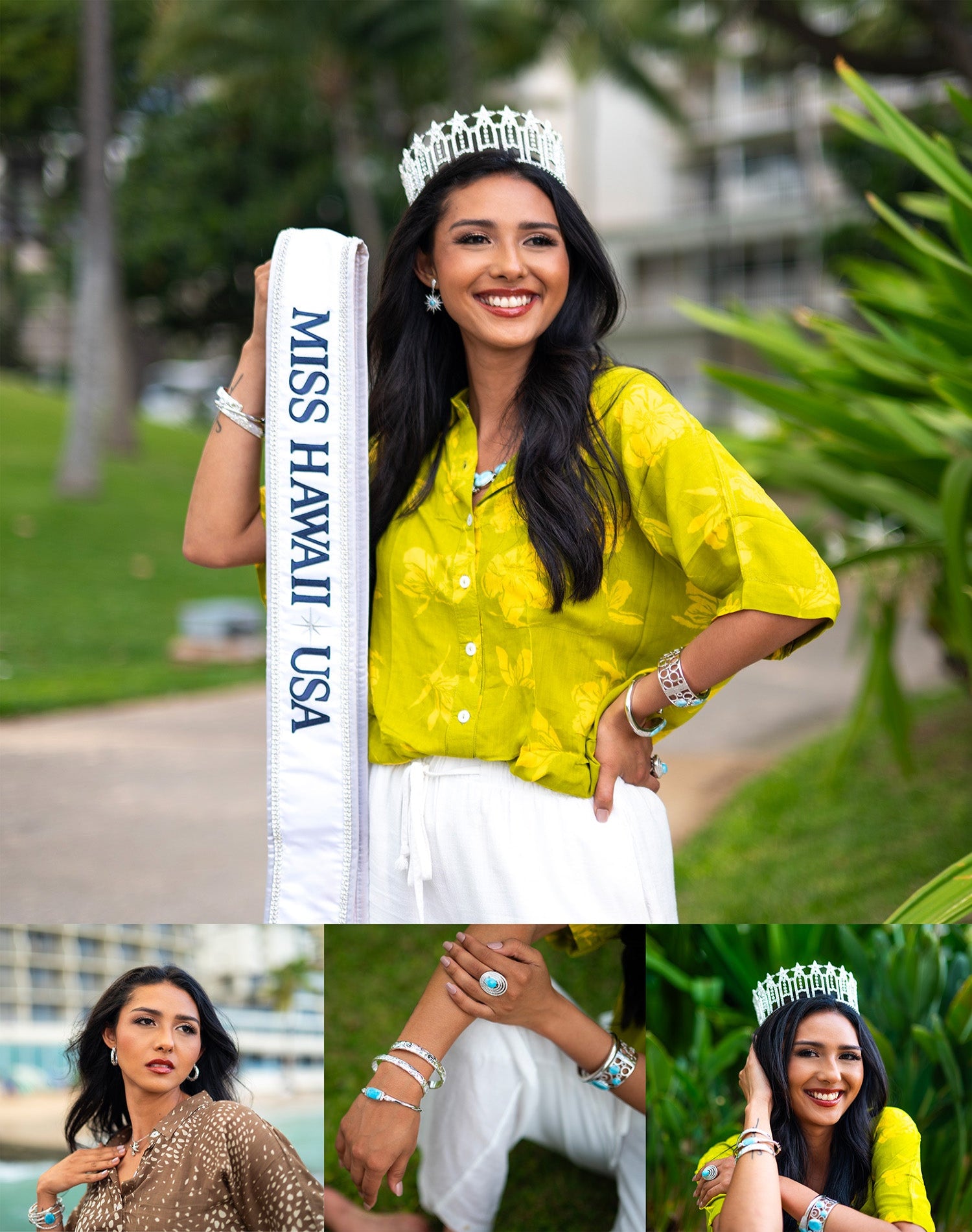 Issha, who earned her crown competing as Miss Hilo USA, will proudly represent Hawai‘i on the national stage at Miss USA. A model, digital marketing specialist, and proud Filipina, Issha brings both beauty and brilliance to everything she does. With experience in Miss Philippines Hawai‘i 2023 and Miss Hawai‘i USA 2019, she embodies growth, resilience, and grace. She wears our Larimar Jewelry, a perfect reflection of her versatility, strength, and the calm power of the islands.