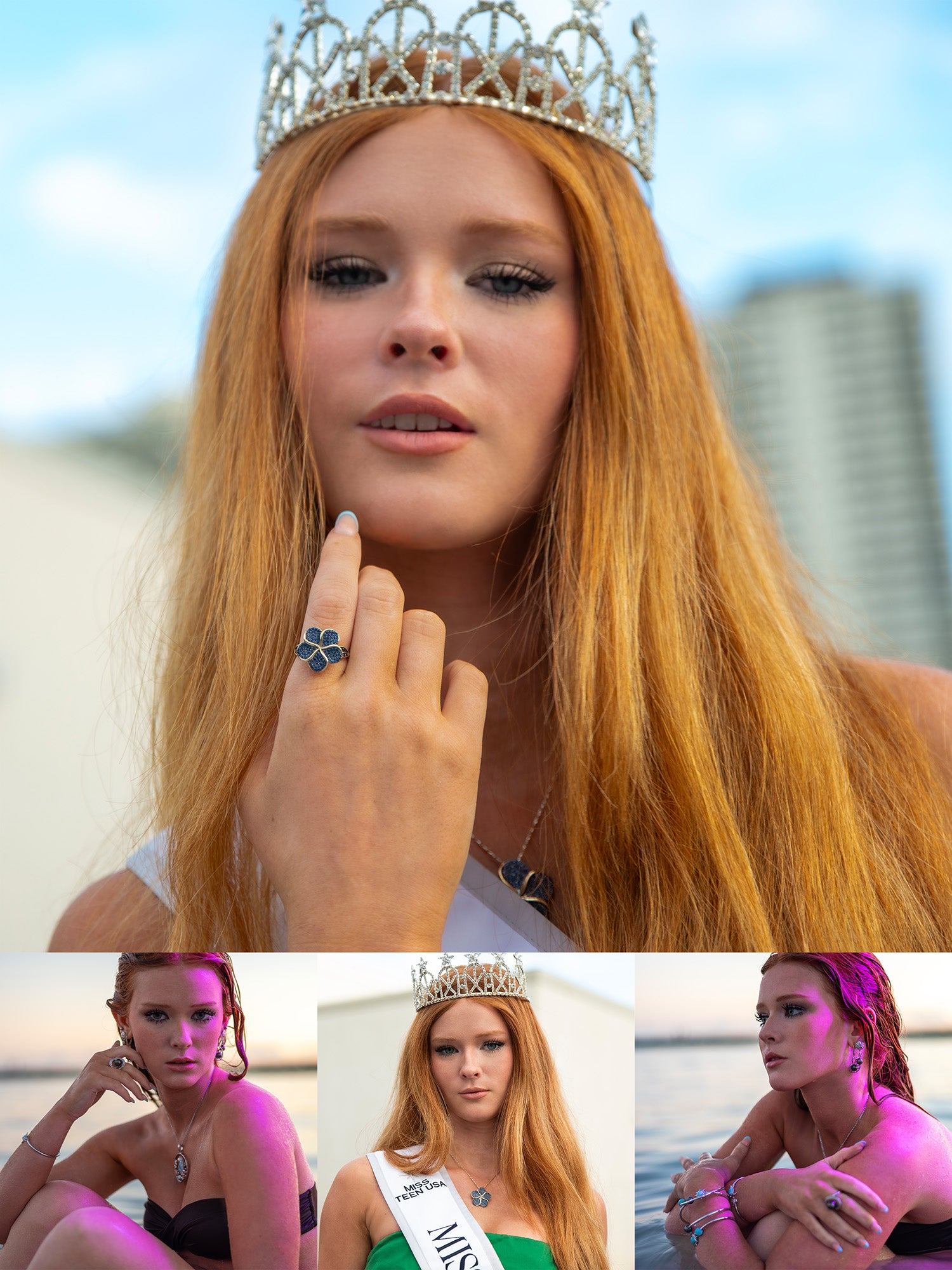 Set against the rich colors of Dole Plantation, Callie shines in our Multicolor Hawaiian Heirloom Collection. As a first-time pageant contestant, her confident presence and radiant smile capture the timelessness of heirloom design. Like the jewelry she wears, Callie is bold, classic, and unforgettable.