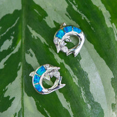 This 925 sterling silver dolphin pendant features our original Nai'a motif paired with paradise blue sustainable opal.