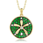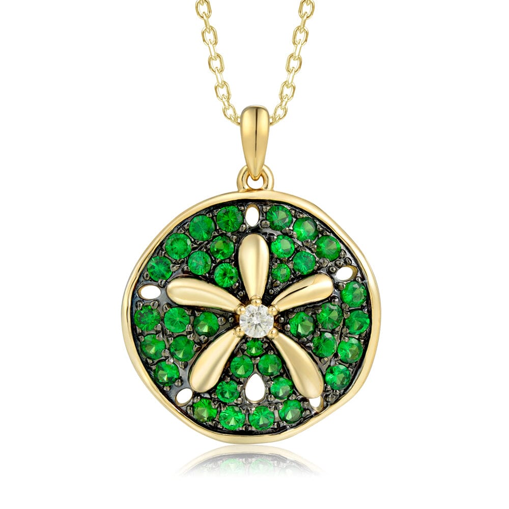 This 14K solid yellow gold pendant features our original sand dollar motif paired with tsavorites and diamonds.