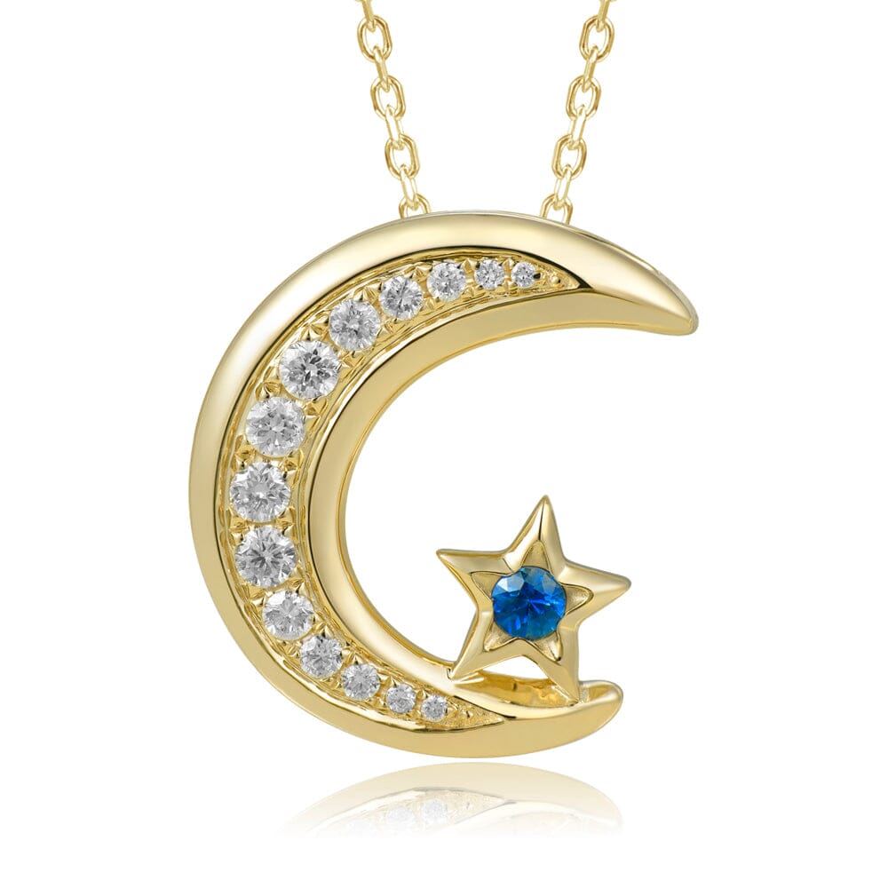 This 14K solid yellow gold pendant features our original moon & star motif paired with sapphire and diamonds.