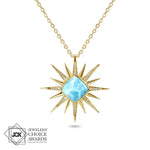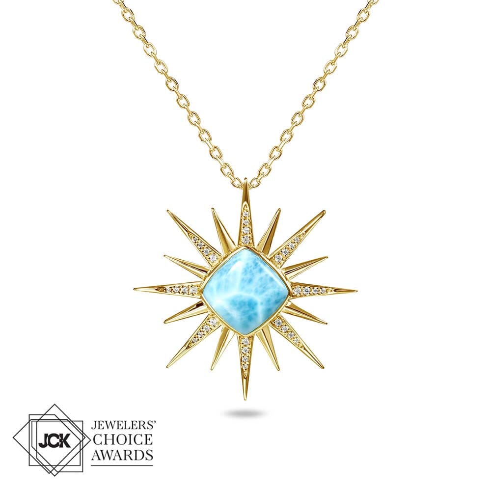This 14K solid yellow gold star pendant features our award-wining hoku motif in art deco style paired with a hand-selected larimar gemstone and lined with white topaz.