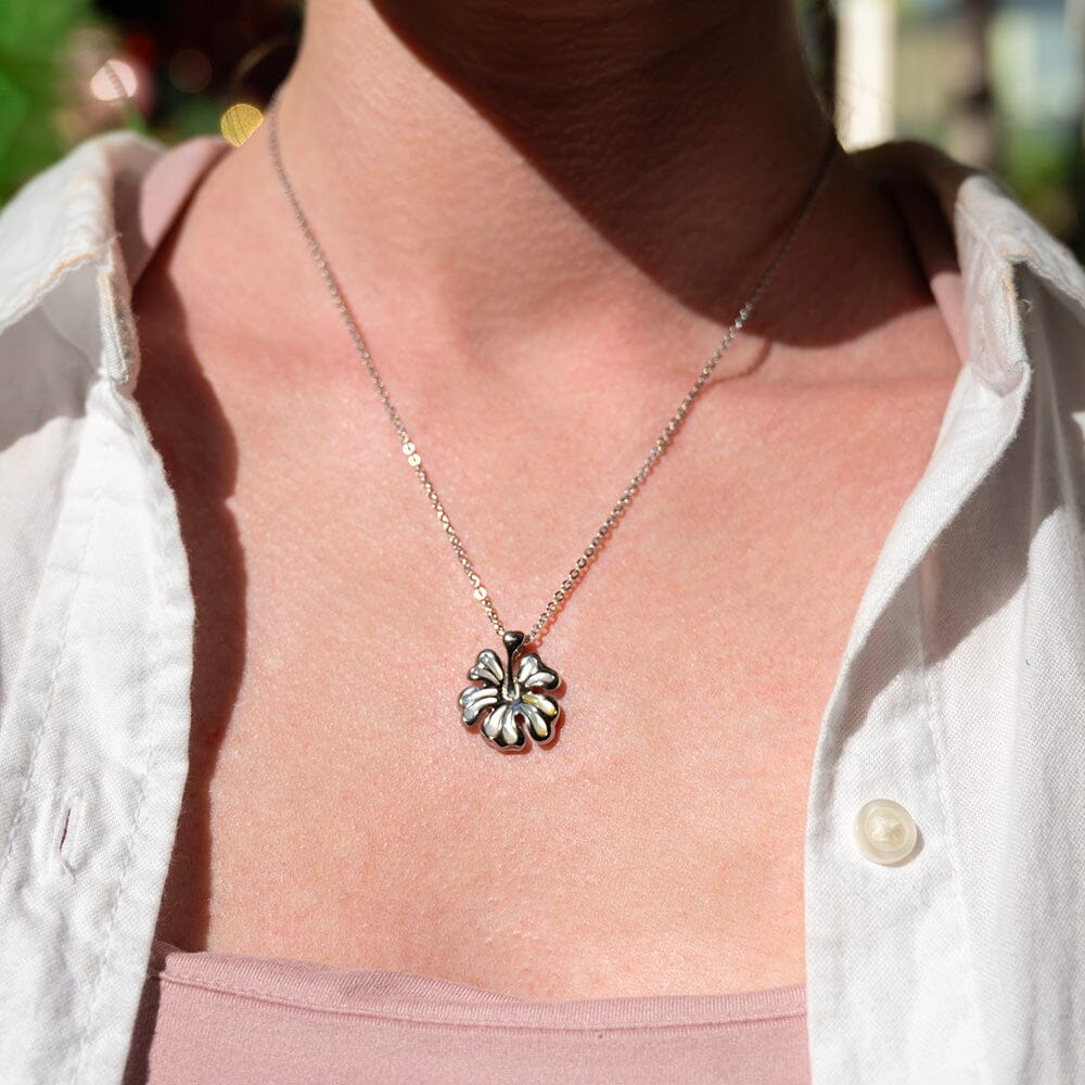 This 925 sterling silver flower pendant features our original hibiscus motif paired with white mother of pearl shells.