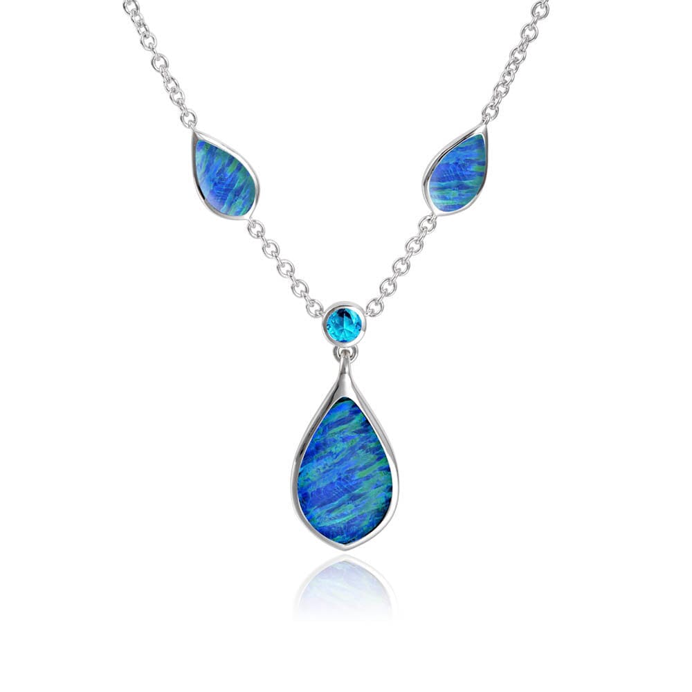 This 925 sterling silver oval mandorla necklace features a blue topaz gem paired with our prismé opal - our next generation of sustainable opal.